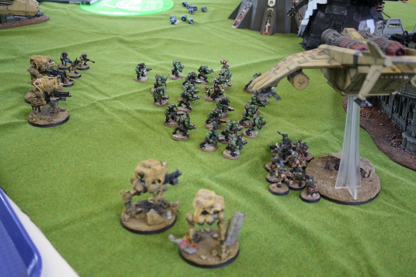 The shooting phase saw the Elysians on the left flank wipe out another 30 Boyz, leaving the Wierdboy to fail his morale check and flee into the knives of the waiting Elysian Squad, who promptly dispatched him. The Vendettas put the Stompa in their sights, and fired all their Lascannons into the monstrosity. They managed to claim a Structure Point and Stun the crew. The Space Marines in the Bastion continue to pour fire down upon their Warbikker assailants, killing a handful of them.